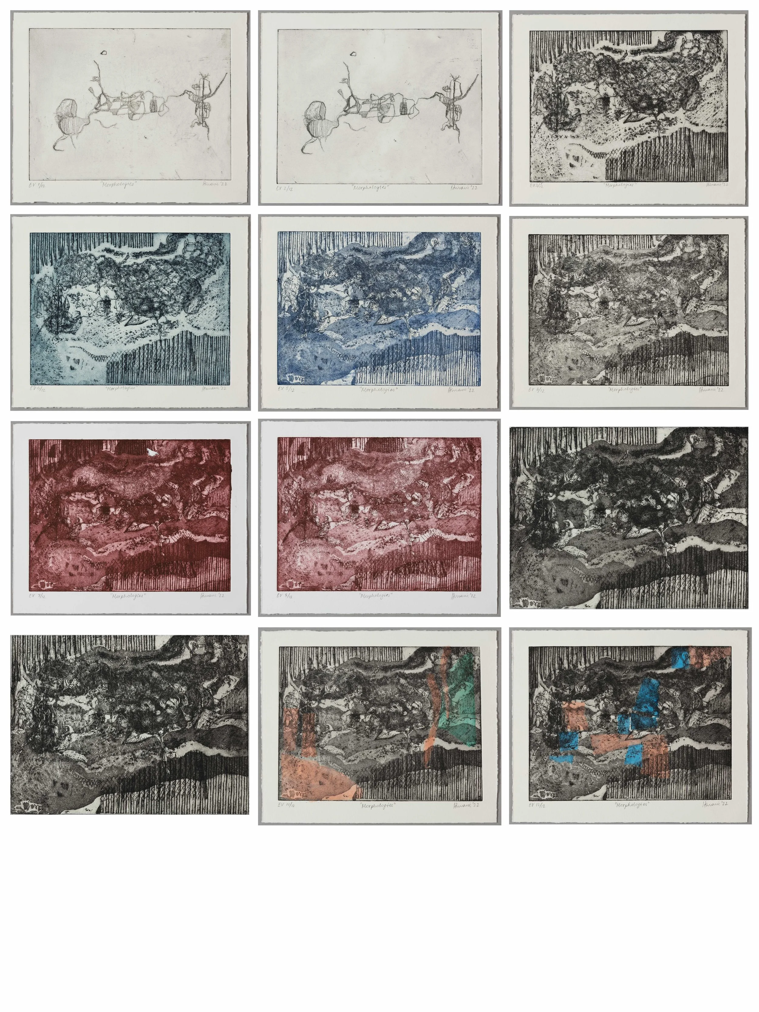 Morphologies is a set of 12 prints made by returning to a single zinc plate over 12 weeks, allowing the surface to change gradually over time. Each stage—etching, aquatint, engraving, chine-collé—reshapes the plate, much like layering and reworking a painting, so forms, edges, and textures continuously shift.